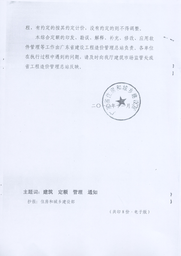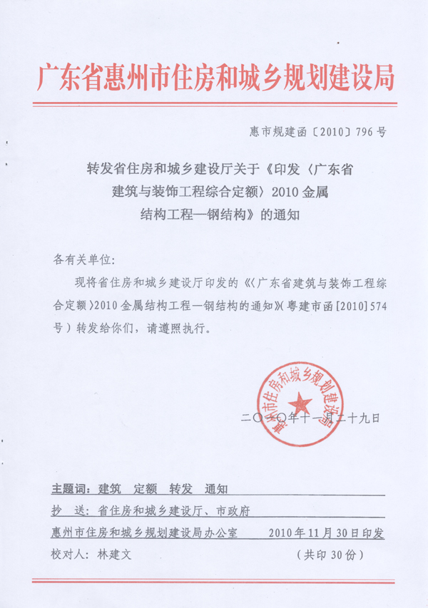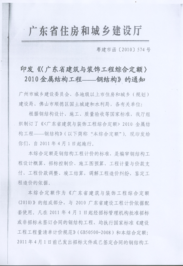 转发省住房和城乡建设厅关于《印发〈广东省建筑与装饰工程综合定额〉2010金属结构工程—钢结构》的通知