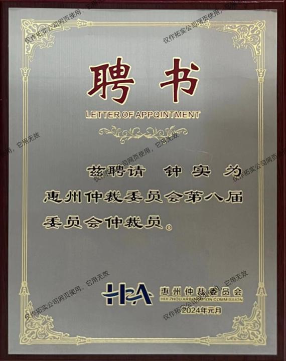 公司董事长钟实先生被聘为惠州仲裁委员会第八届仲裁会仲裁员聘书