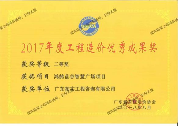 公司荣获广东省工程造价协会2017年度工程造价优秀成果奖二等奖证书