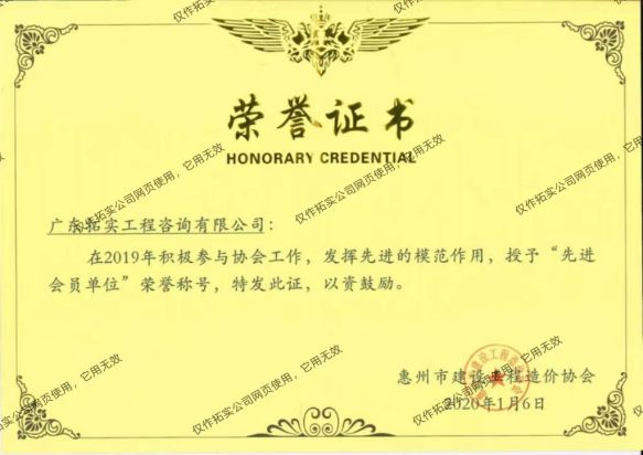 公司荣获2019年度惠州市先进造价咨询单位会员证书