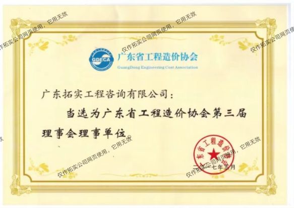公司当选为广东省工程造价协会第三届理事会理事单位证书